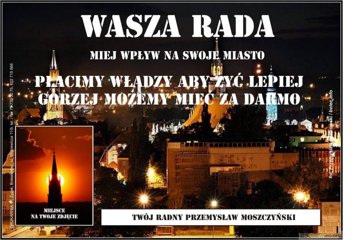 Czym się ludzie emocjonujecie!! Kto zajmie fotel w ratuszu?! Miejcie trochę rozumu i krytycznego spojrzenia na bolesławiecką rzeczywistość. Postać ta, nie ma realnego wpływu na gospodarkę i ekonomię. Jak sobie sami zorganizujemy życie i jego komfort, tak będziemy mieć. Dlatego nie pójdę na wybory. Po prostu, nie mam w tym interesu zawodowego, społecznego i ekonomicznego. Zaś życie prywatne, czas wolny, działalność kulturalną i charytatywną każdy z nas potrafi sobie zorganizować nieźle we własnym zakresie. Przedsiębiorca. Człowiek wolny od urzędowego uzależnienia.