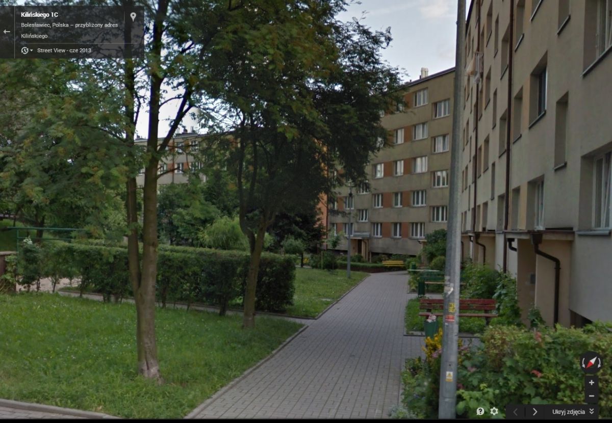 ...punktu, natomiast ja podążam ze środka osiedla, mniej więcej w kierunku z którego ów wyszedł. Jako, iż zaintrygował mnie fakt kominiarki (nie mającej swego poparcia w temperaturze tamtejszej nocy) postanowiłem przeciąć drogę owej tajemniczej postaci. Zgadywałem, iż jego reakcja zdradzi intencje... Niestety osobnik ów widząc zmianę mojego kierunku oraz dostrzegając nieunikniony kurs kolizyjny, mógł przestraszyć się mojej złośliwej, złej i brzydkiej postaci. Korzystając z pozostawionych otwartymi - drzwi klatki (na wprost na zdjęciu z "google maps", klatka zasłonięta krzakami ...zgaduję - 10b), wchodzi do środka, nogą odblokowuje nóżkę (blokującą drzwi w określonym punkcie), zamyka je od środka oraz spoglądając w moim kierunku przykłada telefon do ucha (co jednoznacznie sugeruje blef podyktowany strachem, zapomniał bowiem udać, iż wybiera jakiś numer...)
