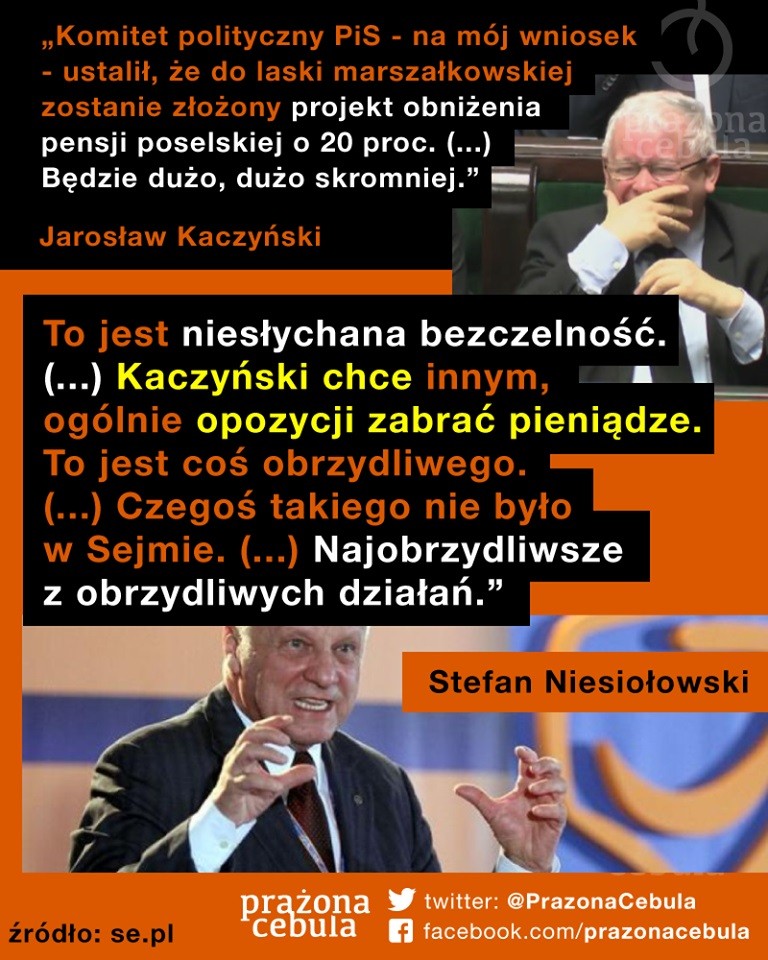 Stefan Niesiołowski w geście przywiązania do koryta demokracji... Opozycja już zaczęła gardłować, że Kaczyński gnębi opozycję obniżając wszystkim posłom i senatorom pensje. Ciekawe kiedy Michał Boni zacznie rwać szaty przed obliczem Fransa Timmermansa w Brukseli. Myślicie, że Unia uchwali rezolucję o łamaniu praw człowieka?