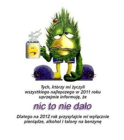 Ja wam wszystkim i sobie samemu życzę aby w 2012r nie było żadnych podwyżek ale to nas nie ominie. Moje marzenie to jest protestować bo mi nic nie pozostało jako biednemu renciście tylko wspierać młodzież bo oni dopiero dostaną w D. Pę a szczególnie młode małżeństwa. Ja będę miał przykład 30 ci zł a na opłaty po podwyżkach zabiorą trzy razy tyle i jak tu nie wyjść na ulicę. ŻYCZĘ WAM WSZYSTKIM TYCH 12 STU MIESIĘCY O PEŁNE WYROZUMIENIE I DAJCIE NAM GODZIWIE ODDYCHAĆ A my biedni mieszczuchy trzymajmy się razem.