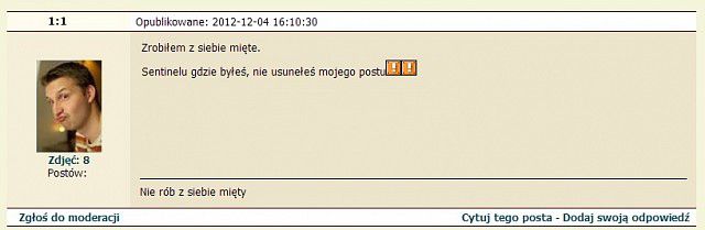Sorki to nie jest już śmieszne ale wklejam w tym temacie. Dzisiaj emem strasznie chamsko się zachował. Chciał anonimowo wpisać podły komentarz w stosunku do użytkownika i prezydenta: "posuwacie się nawzajem". Gdy się zorientował że był zalogowany, to szybko podmienił swojego nicka na ~1: 1 ale zapomniał że jego własny portal pokazuje w ostatnich komentarzach kto tak naprawdę napisał komentarz! Nie usunął też stopki "nie rób z siebie mięty", a przecież anonimy nie mogą mieć stopki... Wstyd emem że anonimowo piszesz takie chamskie podłe komentarze a potem udajesz że to robią użytkownicy!