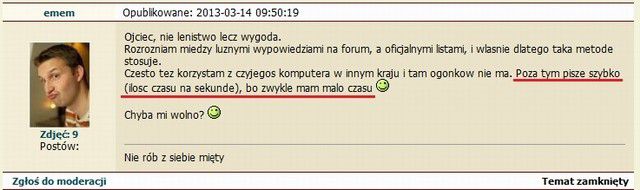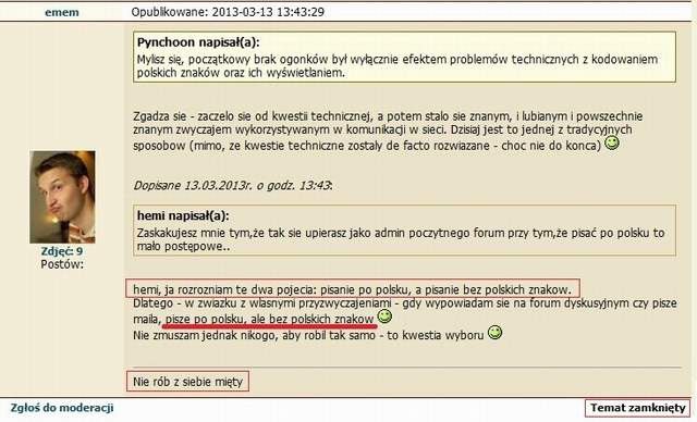 Emem: "rozróżniam te dwa pojęcia: pisanie po polsku, a pisanie bez polskich znaków", i dalej - "pisze po polsku, ale bez polskich znaków".