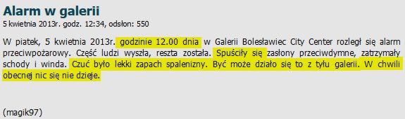 Dzień dobry, dzisiaj od pięciu godzin Bolec podaje jako sensację niesprawdzoną informację. Jest mowa o "zapachu spalenizny" i że "być może działo się to z tyłu galerii". Oczywiście nic się nie stało, ktoś przez przypadek włączył alarm. To jednak nie przeszkadza Bolcowi robić ludziom wodę z mózgu :) Miłego dnia!