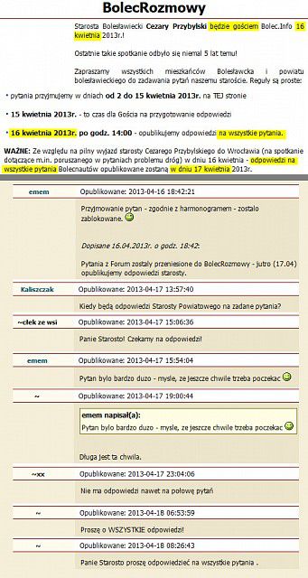 Z wielkim zadęciem redakcja ogłosiła na początku kwietnia rozmowę ze starostą. Jak każda rzecz na bolcu ta również była napompowana, bo użycie słowa „rozmowa” to duża przesada. Pytania ludzie musieli zadać wcześniej, nie na żywo (jak to bywa podczas normalnej rozmowy). To jednak nie najgorsze. Kłopot powstał z odpowiedziami. Najpierw miały być 11 kwietnia. Nie było. Przesunięto termin zadawania pytań. Potem odpowiedzi miały być 16 kwietnia. Pojawiło się trochę. Potem miały być 17. Znów nie było. Dziś mamy 21 kwietnia, a odpowiedzi wciąż brak. Starosta nie odpowiedział, czy redakcja nie wkleiła?
