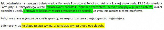 Pan Marczewski nie zna umiaru w reklamowaniu kumulacji przy okazji pisania o pobiciu pracownicy kolektury. Przykre.