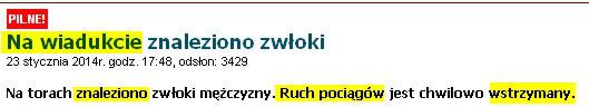 Druga wpadka wynika chyba z tego, że dupy im się nie chce ruszyć na miejsce zdarzenia. Po pierwsze, wypadek nie był na wiadukcie, tylko na torach, ze sto metrów od wiaduktu. Po drugie, chłopaka potrącił pociąg, a nie, że znaleziono ciało. Po trzecie, wcale nie wstrzymano ruchu pociągów, tylko przekierowano na drugi tor. Trzy byki w dwóch zdaniach.