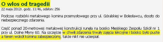 Opinie opiniami, ale jak można zabezpieczyć miejsce rozbiórki w postaci dwóch osób, które "demontowały" komin nie mając przy tym specjalistycznego sprzętu. Rozumiem, że spowodowane jest to kryzysem w Polsce i nie stać zleceniodawcy czy pracodawcy na wynajęcie chociażby dźwigu ;)