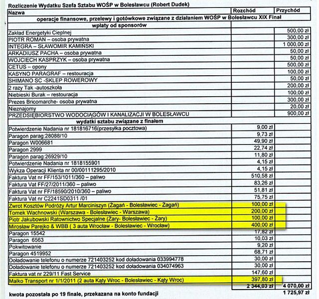 Niezle dorobily sie na boleslawieckiej wosp zespoly Czeremszyna (7500 zl) i ten z Lublina (3500 zl ). Razem daje to 11 tys. na wystepy ktorych boleslawianie nie widzieli. Na Czeremszyne prawie nikt nie przyszedl a ten z Lublina nawet nie wystapil w naszym Boleslawcu! A kase dostali! Wklejam rozliczzenie z zeszlego roku gdzie koszty byly 2 tys.