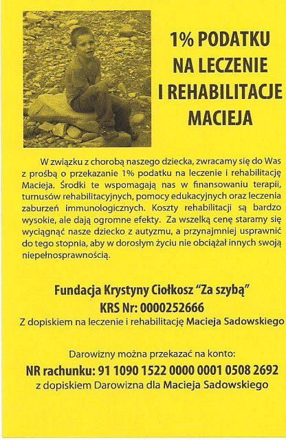 Witam. Jeżeli nie mają Państwo jeszcze pomysłu co zrobić z 1 % podatku to bardzo prosimy o przekazanie go na konto Macieja. Pozdrawiam.