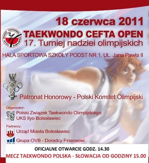 JUŻ DZISIAJ. ZAPRASZAMY! Miejski Ośrodek Sportu i Rekreacji w Bolesławcu, Polski Związek Teakwondo Olimpijskiego UKS Ilyo Bolesławiec zapraszają na TEAKWONDO CEFTA OPEN 17 Turniej Nadziei Olimpijskich 18. 06. 2011.