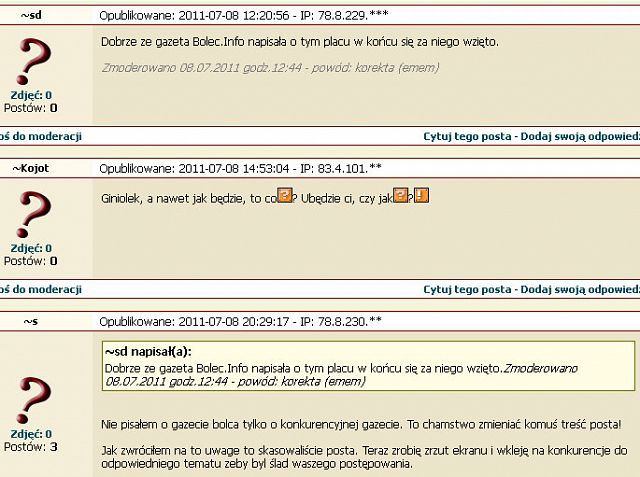 Emem chamsko zmienił treść mojej wypowiedzi na forum! To niedopuszczalne że tak się robi na Bolcu zmieniając komuś treść. Jak zwróciłem na to uwagę to mnie wykasowano. Teraz zrobiłem zrzut i wklejam bo potem jak zwykle będą udawać, że nic nie było. Do tej pory wycinali komentarze teraz zabrali się za zmienianie treści.