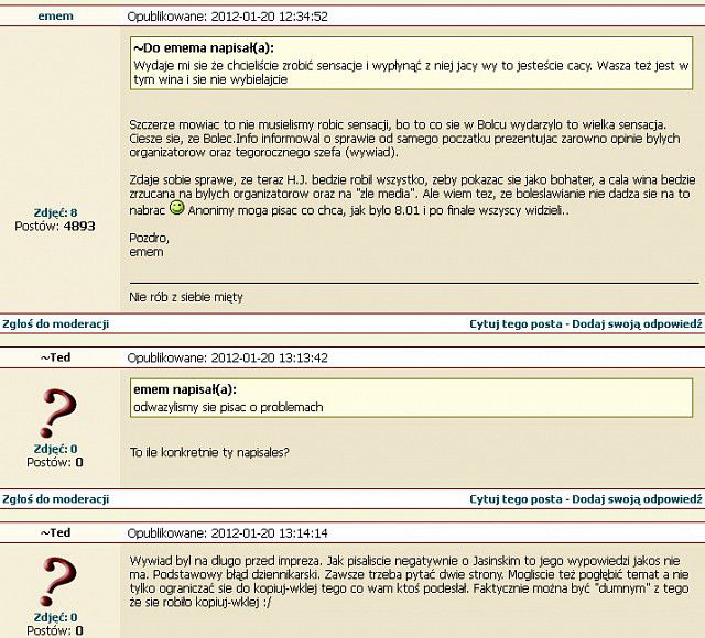 Nie broniąc tu absolutnie nikogo zapytam Cię dlaczego uważasz, że to bolec zrobił pośmiewisko? Przecież to jakiś nawet pewnie niezalogowany "ktoś" dał taki "cynk" na ich stronie. Portal ma to do siebie, że takie "cynki" może puścić każdy. Więc nie próbuj wciskać ludziom kitu bo sam dobrze wiesz jak to działa. Jutro daj cynk, że puściłeś bonka i pewnie też się ukarze, ale czy tu o to chodzi, pewnie nie. Co do znikających postów to się nie wypowiem gdyż moje jakoś tak wyszło, że nie znikają. Pozdrawiam i dobrej nocy.
