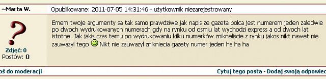 Ogólnopolskie periodyki, codzienniki zawsze raportują swoje dokonania, nakłady, ilość cytatów. Nie widać tutaj niczego nowego, ba! Czy w każdym zakładzie pracy nie są poddawane ocenie wyniki pracowników? Dlaczego natomiast mogą o własnych wynikach pisać gazety, mogą stacje, mogą istnieć nawet rankingi ilości okładek z twarzą gwiazdy a nie może rzeczony Redachtor oraz Graszka powiedzieć niczego bez tych wszystkich komentarzy? Nawet moje ulubione "Nie" zawsze punktuje w stałej rubryce błędy i wpadki konkurecji, a Karolina Korwin-Piotrowska bezlitośnie śmieje się z gazetowych wywiadów gwiazd rozrywki. Tymczasem Redachor przecież nie powinien odpowiadać na ataki personalne, nalepiej dać się zelżyć, zagwizdkować. Podobnie też rzeczona Grażyna nie powinna pisać artykułów o banalnych tematach, przecież ludzie są tak uświadomieni do granic możliwości, że nawet z blachar mają doktoraty. Może Grażyna powinna pisywać felietony językiem Borysa Viana, takie surrealistyczne, niedostępne, a jakże orginalne?W zasadzie wybitni językoznaffcy zwracają uwagę na składnię artykułów, mediolodzy i etycy perorują o stylu, smaku oraz podkładaniu nogi konkurencji. Istny zbiór specjalistow oraz ekspertów. Cieszy mnie,że w tym wszystkim jedni nadal stoją w miejscu, a pozostli robią dobrze swoją robotę, widocznie na przekór innym.