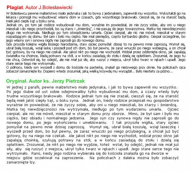 Na portalu Bolec Info chamsko splagiatowali cudzy tekst i wkleili go jako własny. Dawno nie widziałam takiego świństwa w dodatku na Boże Narodzenie. Teraz zamiatają pod dywan sprawę jak wykryli to czytelnicy i żadnych przeprosin. Ciekawe ile tych felietonow J. Boleslawieckiego zostalo tak naprawde splagiatowanych? Chamstwo zeby podpisywac sie pod czyjas pracą i w dodatku na święta! Niżej daje fragment plagiatu, ale cały tekst był splagiatowany. Oryginal jest tu http://www.pmk-wuppertal.de/kwartalnik_nasz_kosciol/kwartalnik29/wigilia.htm Plagiat jest do obejrzenia tu http://tiny.pl/qcbsn bo redaktorzy Bolca juz szybciutko po chichu usuneli artykuł!