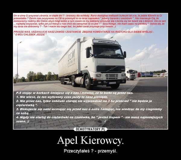 Ale pokazują tu ludzie co poniektórzy jak szanuje się drugiego człowieka i jego ciężka pracę, bez kierowców i transportu doraźnego czyli lądowego nie miał byś co do gara włożyć w tych naszych wspaniałych czasach, zastanów się więc zanim coś napiszesz. Bardzo dobrym przykładem są wasze ukochane markety do których... no właśnie kto dostarcza towar żebyś mógł pójść i wziąć z półki towar, co do tego trzeciego wymienianego zawodu, panie lekkich obyczajów jeżeli zwrócicie uwagę to, to nie są TORÓWKI ponieważ stoją w takich miejscach w które osobówką ciężko wjechać, ale jak siedzi się tylko w domu, i głowę ma się zapchaną pierdołami, to właśnie takie są efekty.