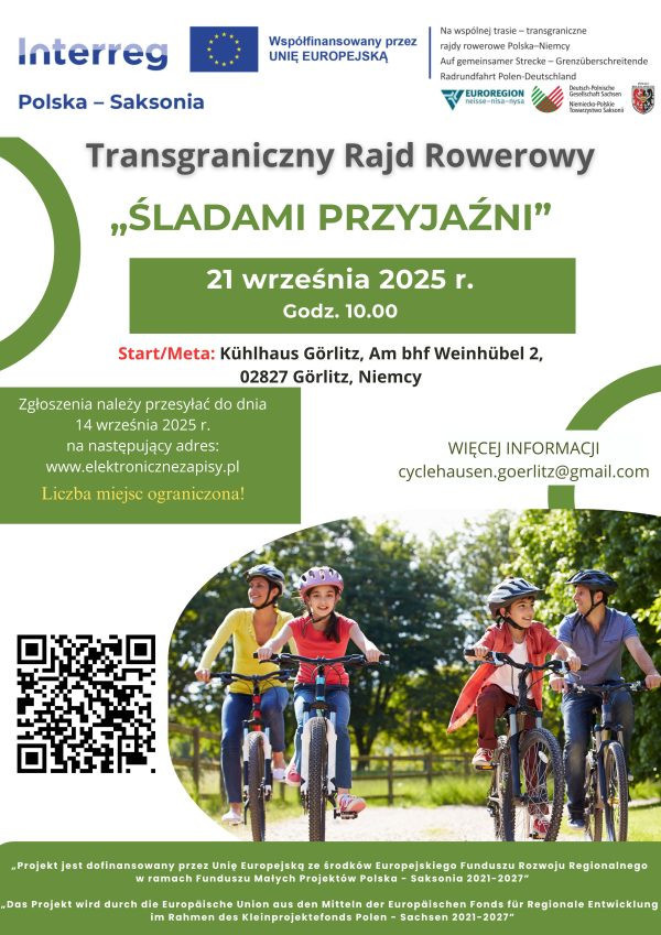 Serdecznie zapraszamy na Rajd „ŚLADAMI PRZYJAŹNI – TRANSGRANICZNY RAJD ROWEROWY” odbędzie się dnia 21 września 2025 r. w powiecie Görlitz – z miejscem startu i mety na terenie Kühlhaus Görlitz, Am bhf Weinhübel 2, 02827 Görlitz, Niemcy.