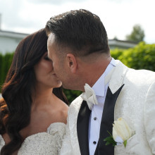 Nowożeńcy zachwycali szykiem i ponadczasowym stylem. On postawił na szytą na miarę marynarkę w kolorze śmietankowym, ozdobioną subtelnym, dekoracyjnym motywem. Kontrastowe czarne klapy oraz elegancka mucha dodały całości współczesnej świeżości i wyrafinowania.