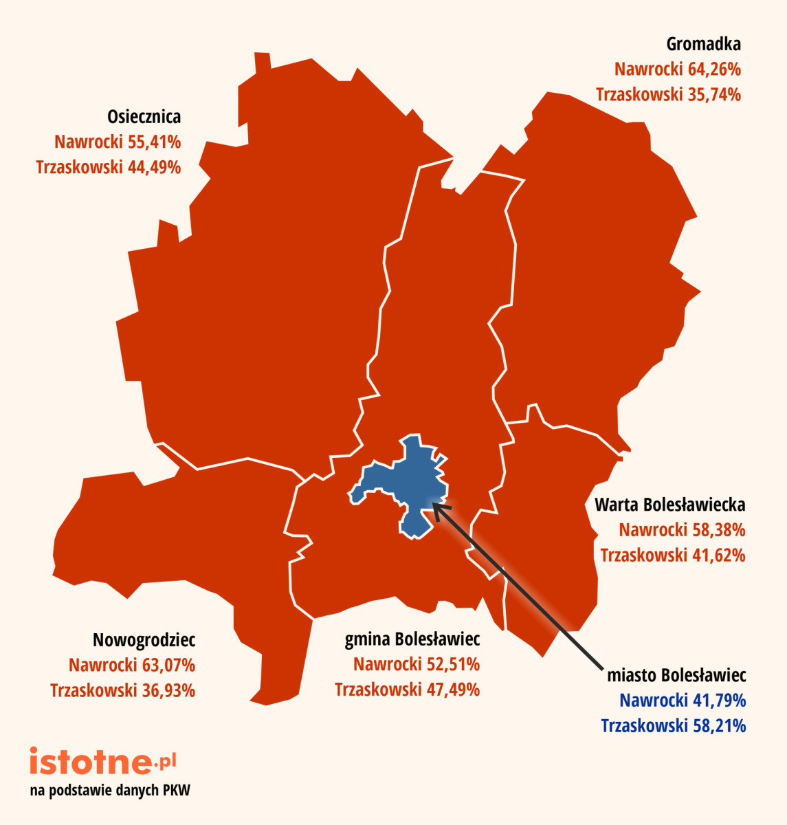 | miasto Bolesławiec | 7 816 / 41,79% | 10 885 / 58,21% |