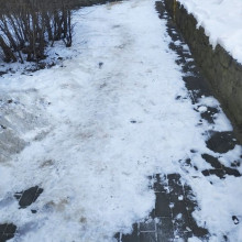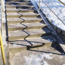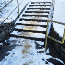 Po interwencji Straży Miejskiej odlodzili jedne schody, a dziesięć metrów dalej już nie, ale chwała za to, że można wyjść do śmietnika.