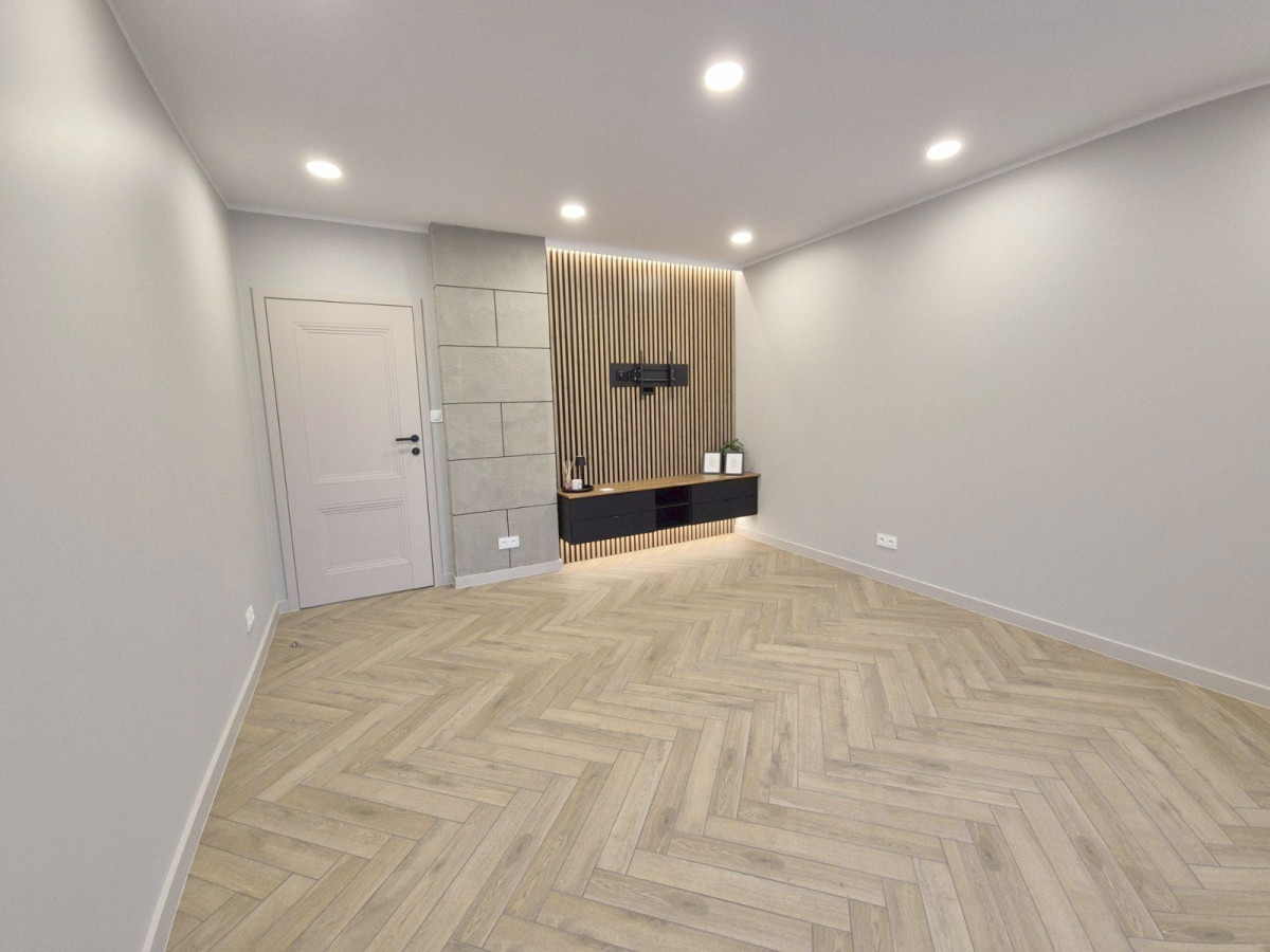 * Podłogi i Ściany: nowe wylewki w całym mieszkaniu, na których położono eleganckie płytki w jodełkę. Ściany wykończone najwyższej jakości farbami marki Tikkurila.