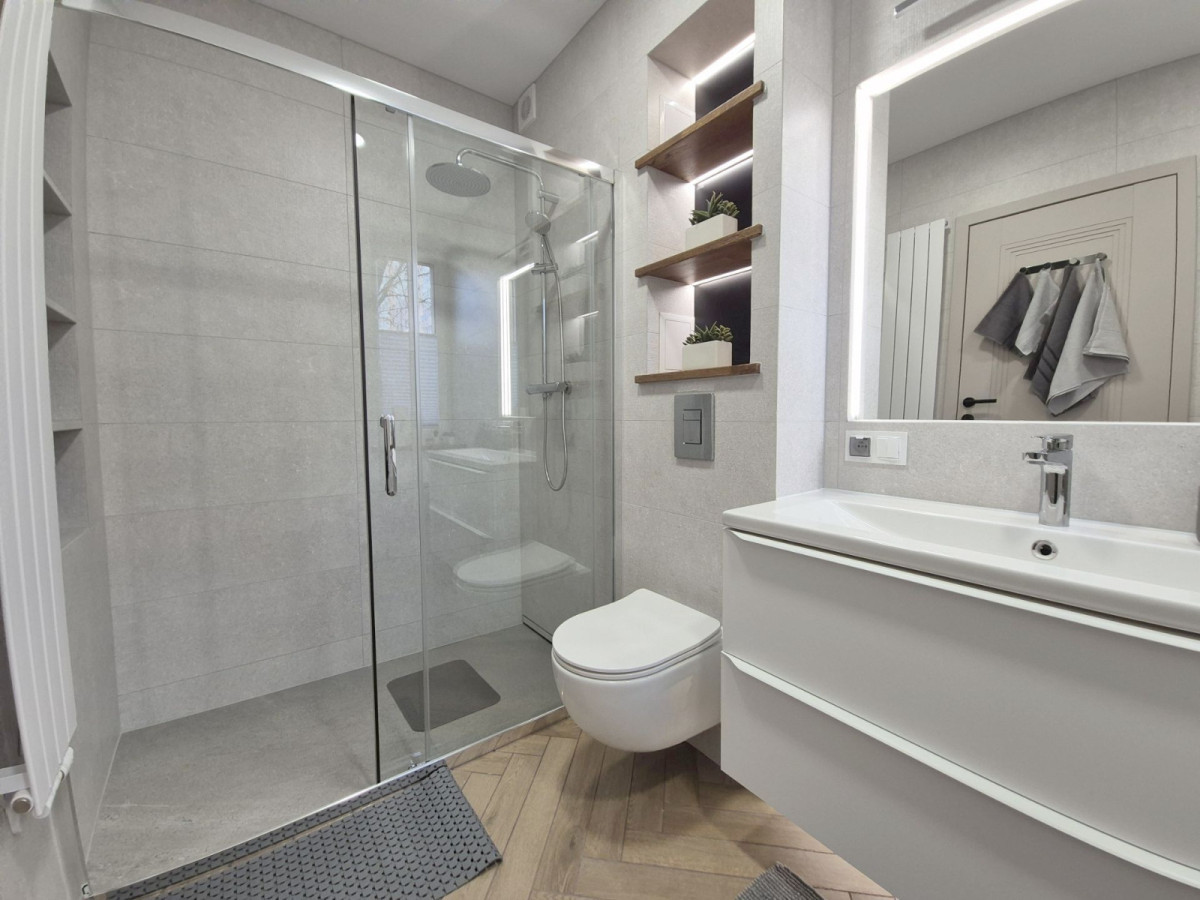 * Łazienka: luksusowy pokój kąpielowy z pełnym nowym wyposażeniem i nastrojowym podświetleniem LED.
