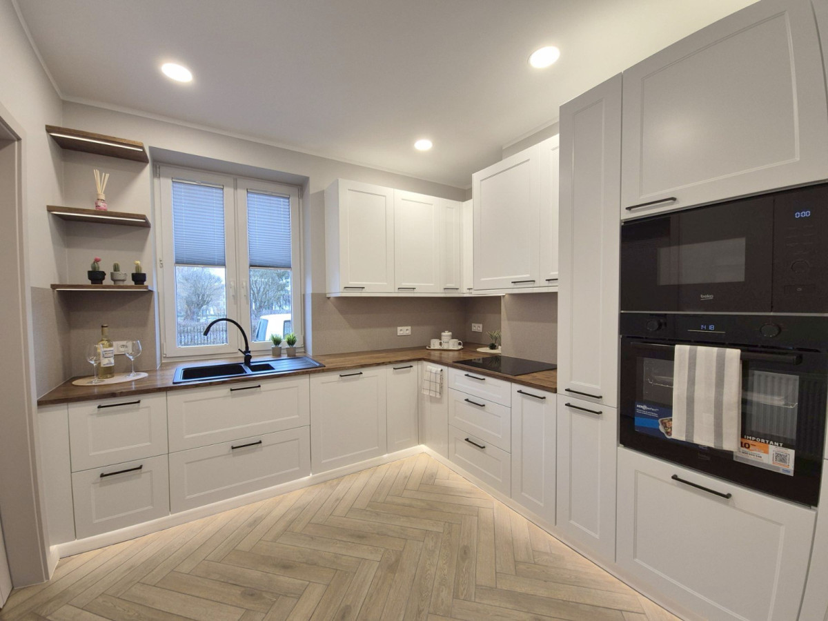 Sercem mieszkania jest kuchnia wykonana na wymiar, wyposażona w kompletny zestaw AGD marki BEKO (lodówka, zamrażarka, płyta indukcyjna, piekarnik, mikrofala, zmywarka, okap).