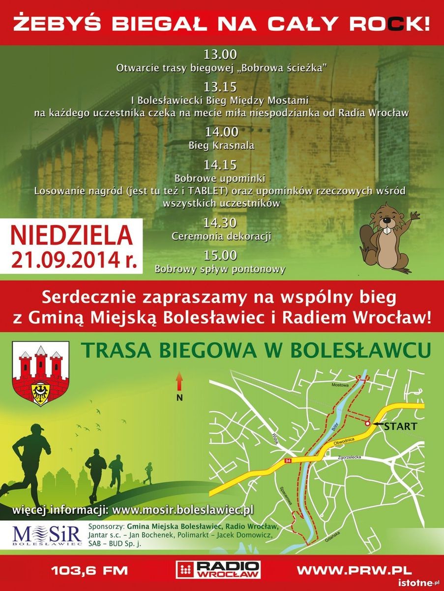 Miejski Ośrodek Sportu i Rekreacji, Gmina Miejska Bolesławiec i Radio Wrocław zapraszają na otwarcie trasy biegowej „Bobrowa ścieżka”, które będzie mieć miejsce w niedzielę, 21 września, przy bolesławieckim wiadukcie. Program poniżej: