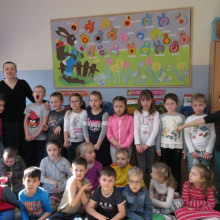Dzieci namalowały wcześniej, pod kierunkiem wychowawczyni, sceny z bajki i z rysunków powstała piękna klasowa galeria. Spotkanie z autorką zakończyło się stawianiem „garbuskowych pieczątek” w zeszytach i (specjalnym tuszem do ciała) na rączkach dzieci. Autorka bardzo dziękuje za gorące przyjęcie w klasie I A.