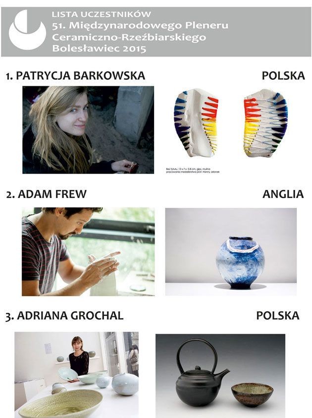 Uczestnikami 51. Międzynarodowego Pleneru Ceramiczno-Rzeźbiarskiego w Bolesławcu są: Patrycja Barkowska - Polska, Adam Frew – Anglia, Adriana Grochal – Polska, Ute Hartwig – Schulz – Niemcy, Maria Joanna Juchnowska - Polska/Norwegia, Barbara Licha - Polska/Australia, Lin Lung – Chieh – Tajwan, Rebecca Maeder – Szwajcaria, Georgi Pachkoria – Gruzja, Michał Podleśny – Polska, Eva Srniková – Słowacja, Katalin Tomay – Węgry, Craig Usher – USA oraz Mateusz Grobelny – komisarz.