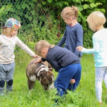 Dzieci bawiły się z psem na podwórku przy budynku. Mogły go dotykać, głaskać, oglądać zęby. Biegały razem z nim i bawiły się. W ten sposób przełamywały strach przed zwierzęciem. Dla psa też było to ważne doświadczenie, bo mógł oswoić się z dużą grupą roześmianych, biegających wokoło dzieci.