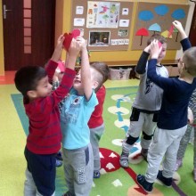 Po przyjściu do przedszkola rozmawialiśmy na temat przyjaźni odwołując się również do filmów. Bawiliśmy się w zabawy integracyjne „Krzesełko przyjaźni”, „Ja cię bardzo lubię”. Wyciągaliśmy z Czarodziejskiego Skrzyni Miłych Słów serduszka, którymi wymieniałyśmy się mówiąc sobie miłe słowa i układaliśmy je tworząc Drzewko przyjaźni. Podczas zabawy wędrujące serca uśmiechaliśmy się do swojego przyjaciela i dotykaliśmy go serduszkiem zgodnie ze wskazówkami nauczycielki.