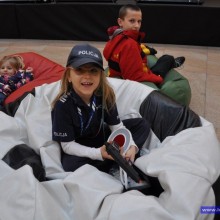 Policjantki z zespołu profilaktyki społecznej prowadziły konkursy i zabawy z dziećmi na temat bezpieczeństwa w ruchu drogowym (wszystkie te dzieci otrzymały nagrody).