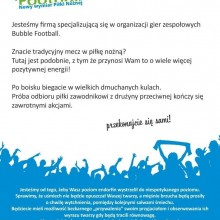 Bubble football to rozrywka, która umożliwia aktywnie i zdrowo spędzić czas zarówno latem jak i zimą. To świetna zabawa połączona z jakże korzystnym dla zdrowia wysiłkiem fizycznym. Mamy także specjalną ofertę dla szkół. Niepowtarzalne lekcje wychowania fizycznego tylko z bubble football - zadzwoń po szczegóły - tel. +48 733 533 070
