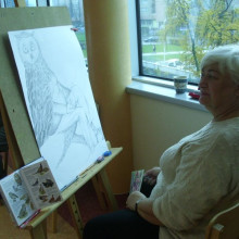 Jadwiga Maryniak. Jadzia… Jagoda… nasza koleżanka „po pędzlu”… uczestniczyła w grupie warsztatów malarskich od 2008 roku, czyli od samego początku jej istnienia. Miłośniczka akwareli, kwiatów, poezji. Oaza spokoju i dobroci.