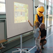 Dzieci poznawały niektóre przepisy ruchu drogowego. Dowiedziały się m.in. jak bezpiecznie przechodzić przez pasy i proszuszać się w drodze do szkoły. Poznały także kilka znaków drogowych. Spotkanie prowadziła Dorota Liebert z bolesławieckiej straży miejskiej oraz Kamila Gutorska z PSB Mrówka – Zieleń Plan Bolesławiec. Na zakończenie spotkania maskotki mrówka i delfin rozdawały dzieciom słodkie upominki.