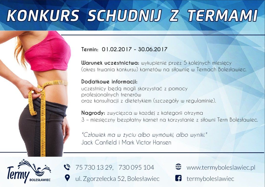 Termin: 01.02.2017 – 30.06.2017. Warunek uczestnictwa: wykupienie przez 5 kolejnych miesięcy (okres trwania konkursu) karnetów na siłownię w Termach Bolesławiec.