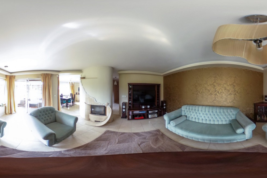 W projekcie salonu najważniejszą rolę odgrywają sofy, chociaż styl narzucił kominek, który wcześniej został zaprojektowany we wnętrzu. Salonowi ciepła, ale i elegancji dodaje tapeta, na jednej ze ścian, w kolorze starego złota.
