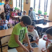 Kolejnym etapem warsztatów były gry edukacyjne, motywacyjne oraz liderskie poszerzające kompetencje współpracy w grupie i komunikacji z osobami w różnym wieku. Młodsi uczestnicy projektu na zakończenie zajęć układali puzzle, tworząc mapę obrazową miejscowości, a uczniowie klas IV–VI uczestniczyli w spotkaniach z zaproszonymi gośćmi. W trakcie spotkań: Pani Helena Madziarz opowiadała o historii szkoły w latach 50., Pani Irena Szoka i Pan Franciszek Zielonka opowiadali o życiu szkolnym w drugiej połowie XX wieku, Pani Grażyna Łucka przybliżyła działalność Komitetu Rodzicielskiego, a Państwo Lidia i Joel Beucherowie porównali system szkolnictwa francuskiego z polskim systemem edukacyjnym.