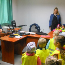 Przedszkolaki w kamizelkach odblaskowych przymaszerowały do posterunku w dwóch grupach. Każde dziecko było ciekawe, jak wygląda miejsce pracy policjanta i jak to jest siedzieć w radiowozie. A kiedy maluchy zobaczyły policyjną maskotkę Komisarza Lwa, bardzo chętnie podeszły, aby przywitać się z wyjątkowym mundurowym.