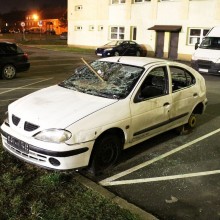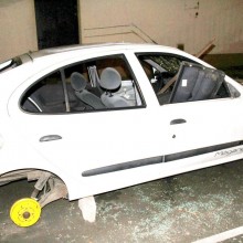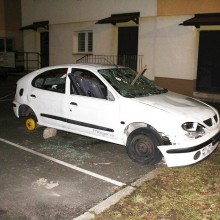 Auto jest coraz bardziej zniszczone. Brakuje tablic rejestracyjnych i kół. Przednia szyba – rozwalona, przebita deską. Zaś szyby boczne i ta tylna są całkiem wybite. Wnętrze zdemolowane.