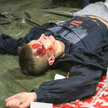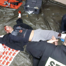 - praca w zespołach, dla których przygotowane zostały scenki z wykorzystaniem pozorantów. (Zadaniem każdego z zespołów było udzielenie pomocy poszkodowanym do czasu przyjazdu zespołu ratownictwa medycznego)