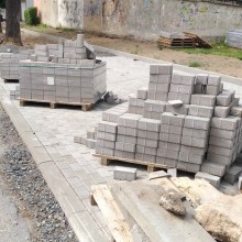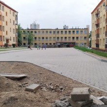 A parking skośny przy garażach jest zaczęty i tak samo – od miesiąca nie ma żadnego progresu, a palety z kostką brukową są sukcesywnie pobierane przez lokalne dzieci.