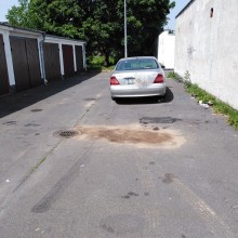 Takie auto od 2 miesięcy stoi między garażami [przy ulicach] Jezierskiego a Wróblewskiego. Przód [...] rozbity.