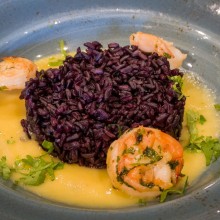 Drugim daniem były krewetki w sosie ze świeżego mango i mleka kokosowego z dzikim ryżem. Mariaż z białym winem z hiszpańskiej Galicji był wyjątkowo udany. Białe wino ze szczepu z rejonu Rias Baixas cechowała rześkość i smak moreli.