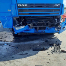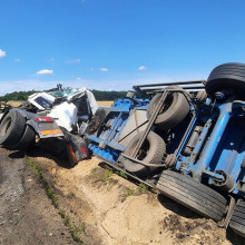 W wyniku wypadku jedna z ciężarówek wpadła do rowu.