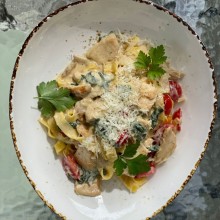 - Tagliatelle Pasta Fresca z makaronu własnej produkcji al dente z kurczakiem, borowikami, białym winem i parmezanem,