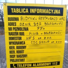 Na ogrodzeniu placu budowy jest także tablica informacyjna, na której możemy przeczytać "Budowa budynku restauracji KFC". Tak więc przy Rondzie im. Lecha Kaczyńskiego będą dwie konkurujące ze sobą restauracje serwujące dania typu fast food.