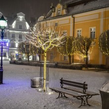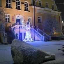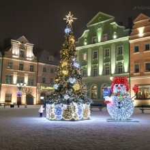 Zaśnieżony rynek w Bolesławcu ze świątecznymi ozdobami wygląda przepięknie