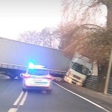 Przy samej restauracji Dąbrówka drogę blokuje tir z naczepą, który wjechał do rowu.