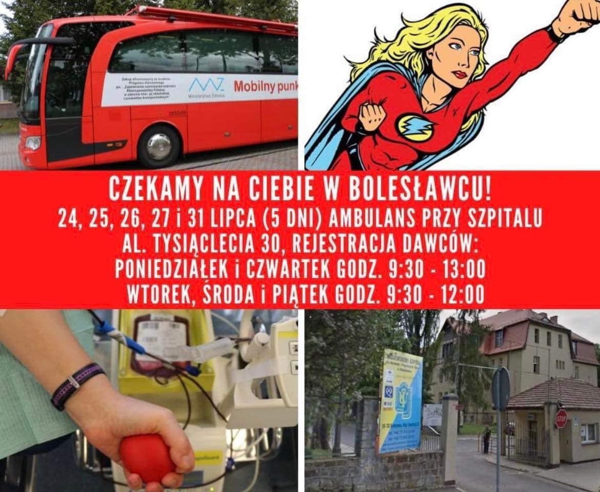 Krew można oddawać w krwiobusie, w Szpitalu Wojewódzkim przy ulicy aleja Tysiąclecia 30, od poniedziałku, tj. 24.07, do czwartku, tj. 27.07, w godzinach 9:30–13:00.